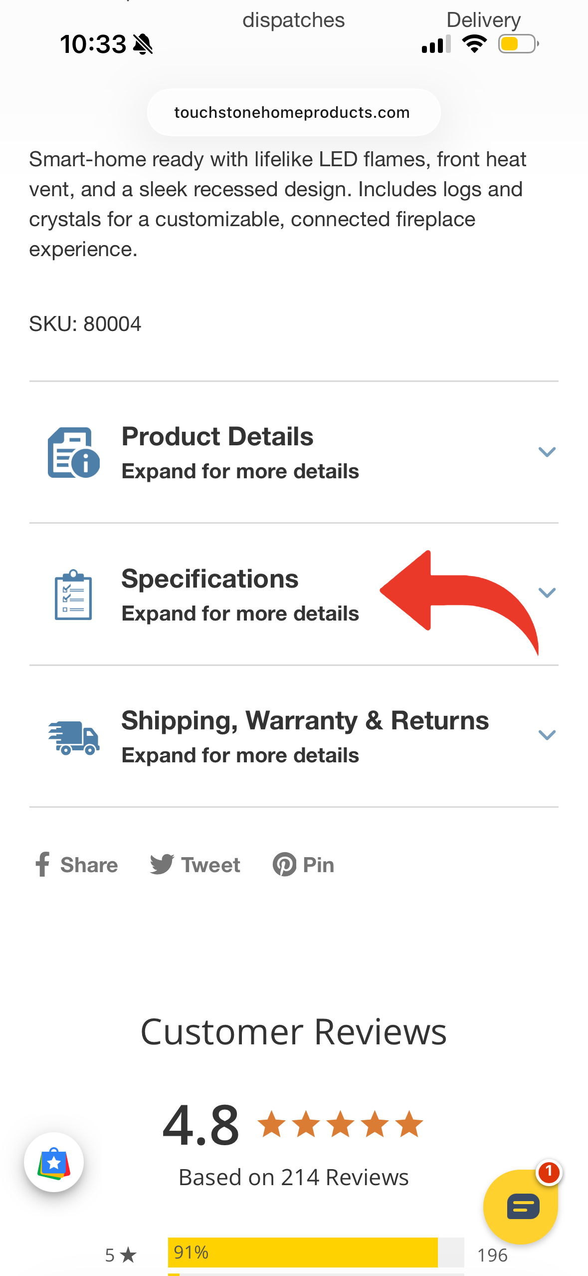 1. On the product page, scroll down and click the SPECIFICATIONS tab.