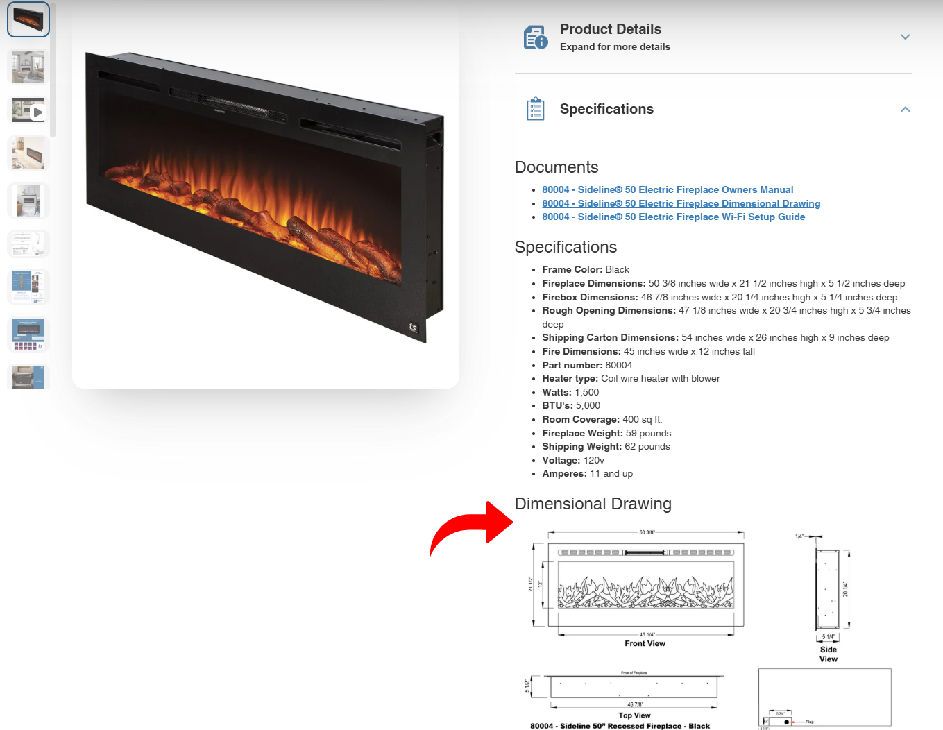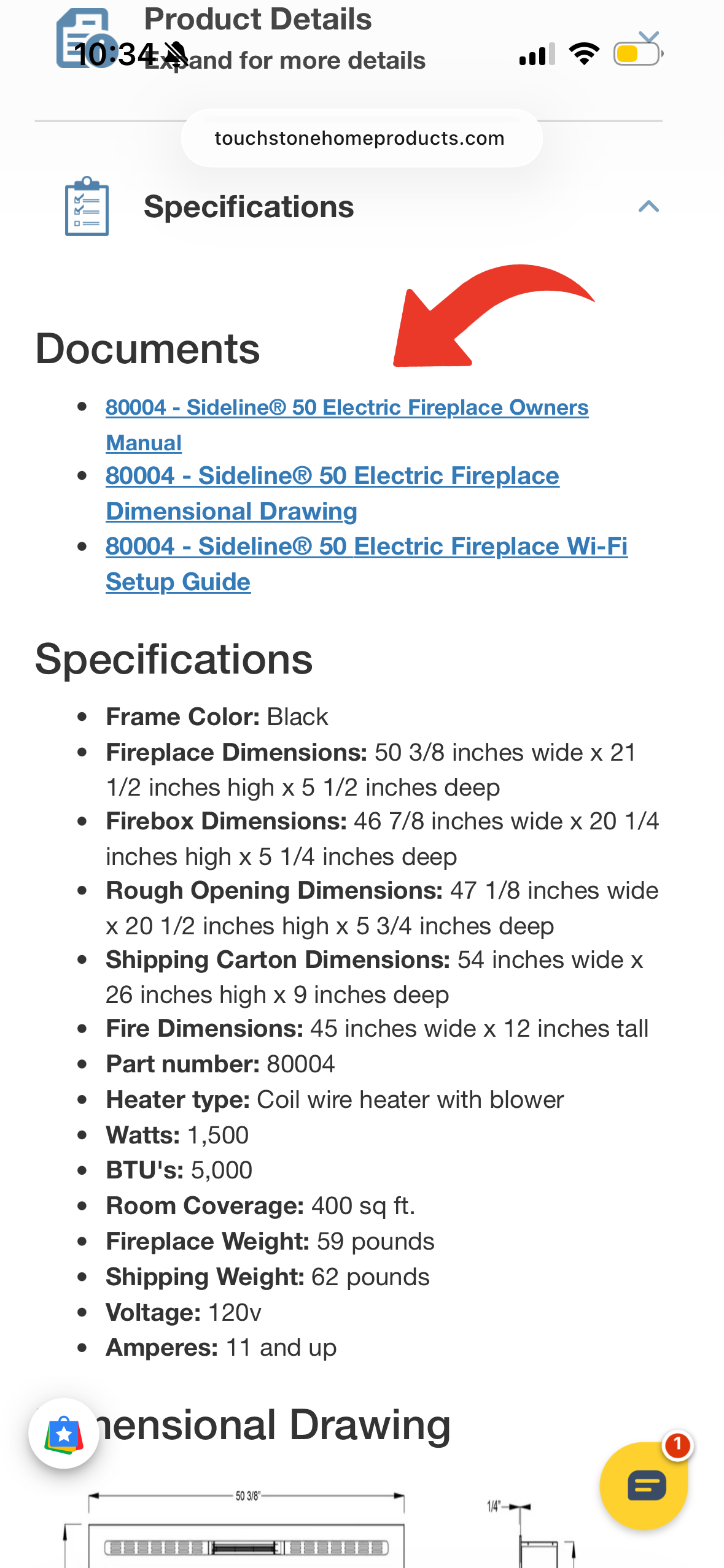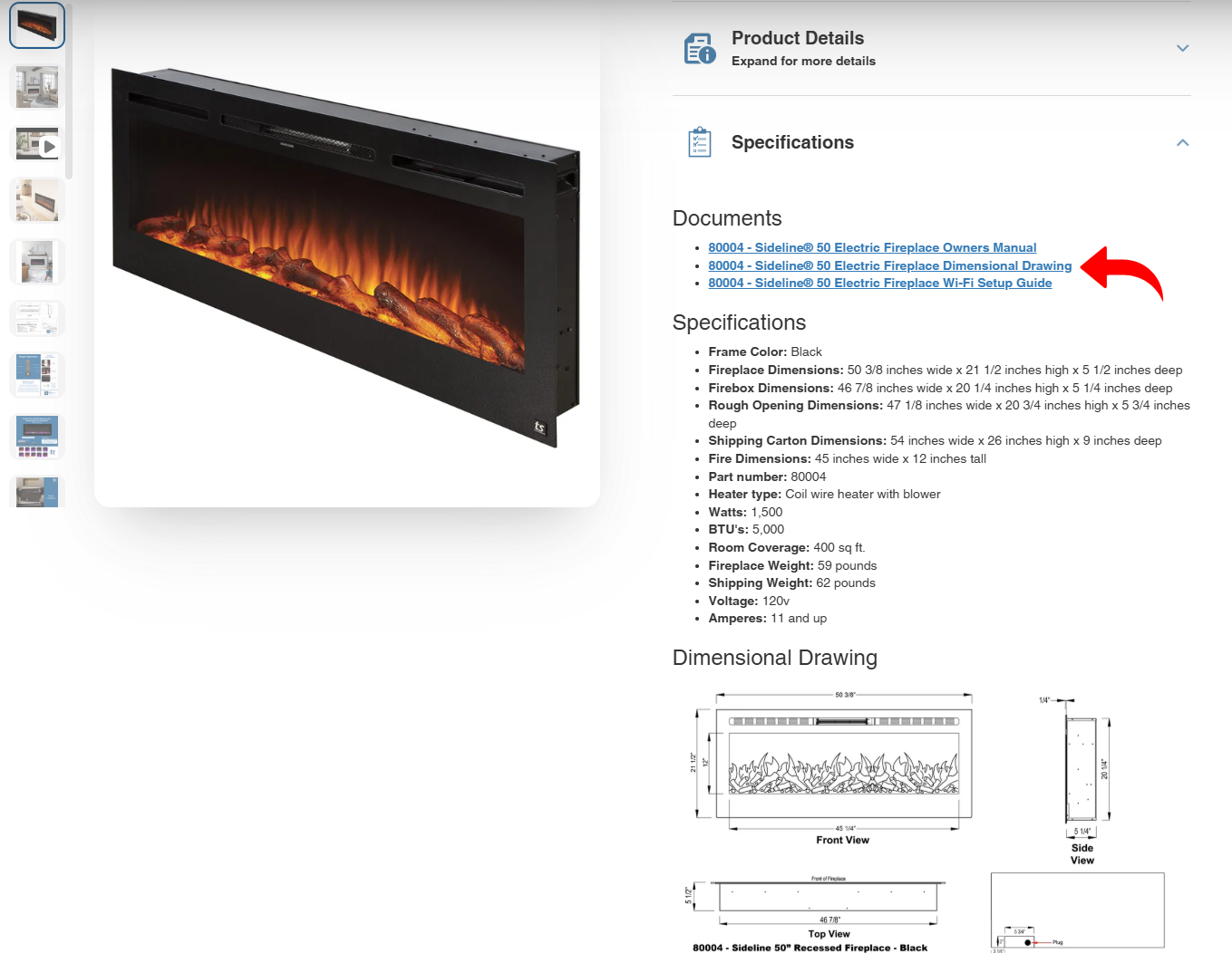 2. On the SPECIFICATIONS tab, under DOCUMENTS click the links to open the owners manual or dimensional drawing.