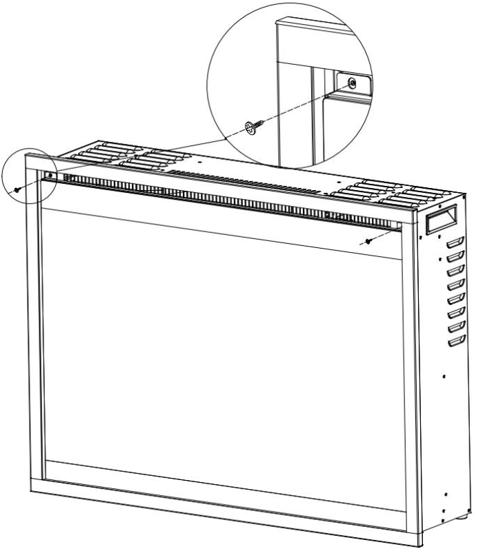 2. After removing screws, tilt glass panel away from the fireplace. Lift the glass panel away from the fireplace to remove the glass panel. Store the glass panel in a soft, dry place.